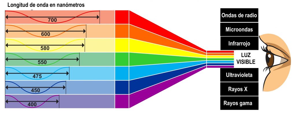 Luz visible: Es la parte del espectro que los ojos humanos pueden percibir. Incluye todos los colores que vemos, desde el rojo (que tiene una longitud de onda más larga) hasta el violeta (que tiene una longitud de onda más corta).
